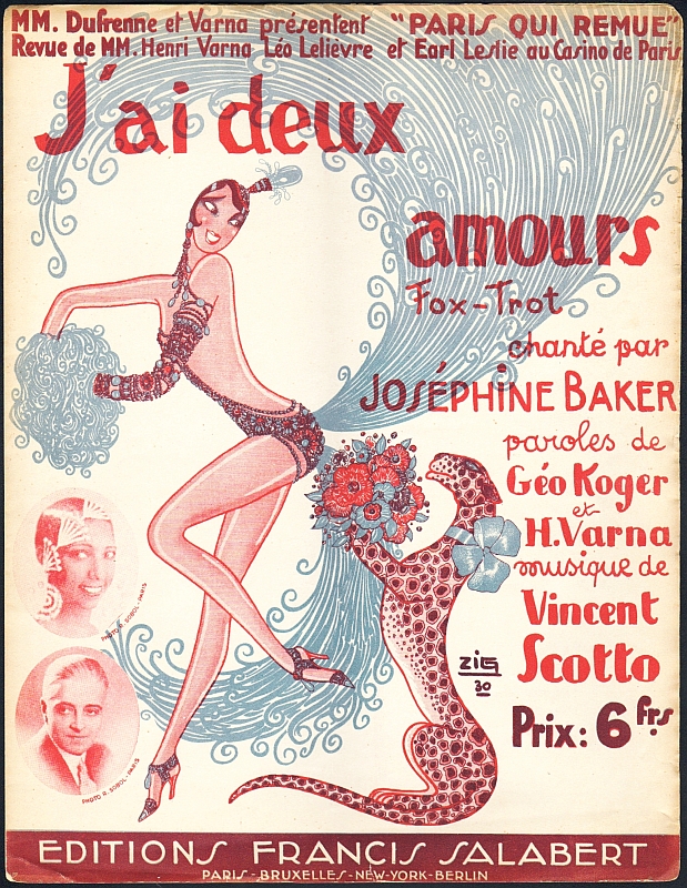 Vincent Scotto (Musik), Géo Koger & Henri Varna (Text): J'ai deux amours. Fox-trot chanté par Josephine Baker. Paris (Editions Francis Salabert) 1930. (EAS 6195). 35 x 27 cm. Artist: Zig <16838> EUR 70,-