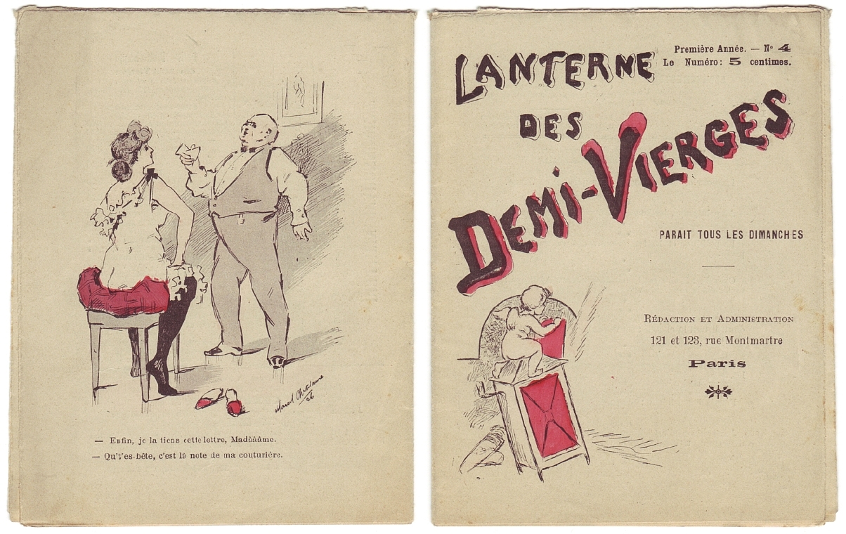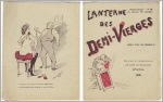 Lanterne des Demi-Vierges. Première année, No. 4. Paris (Louis Babut) (1896). 12 Seiten. Mit 1 blattgroßen Zeichnung von Georges Chamonin. 16 x 12,5 cm. Cover zweifarbig illustriert, Hinterdeckel von Marcel Chablarne