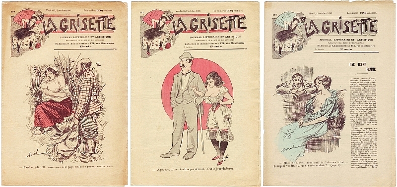 La Grisette. Journal littéraire et artistique. No. 109, 111, 112 (= 3 Hefte). Paris (Louis Babut) 1896. Je 7 Seiten. 29 x 20 cm. Farbige Cover von Avril (2x) und L. Roze