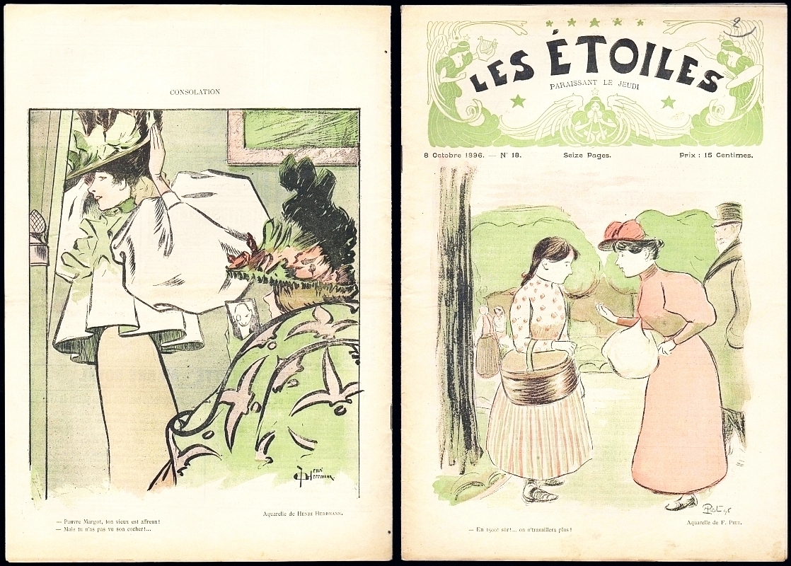 Les Etoiles. No. 18, 8 octobre 1896. Paris (Mascarille) 1896. 16 Seiten, durchgehend illustriert. 32 x 22 cm, farbiges Cover nach Aquarellen von Henri Herrmann. Illustriert von J.P. Besson, J. Belon, F. Piet, G.Ri, G. Wendt (blattgroß), Roy, M. Durand