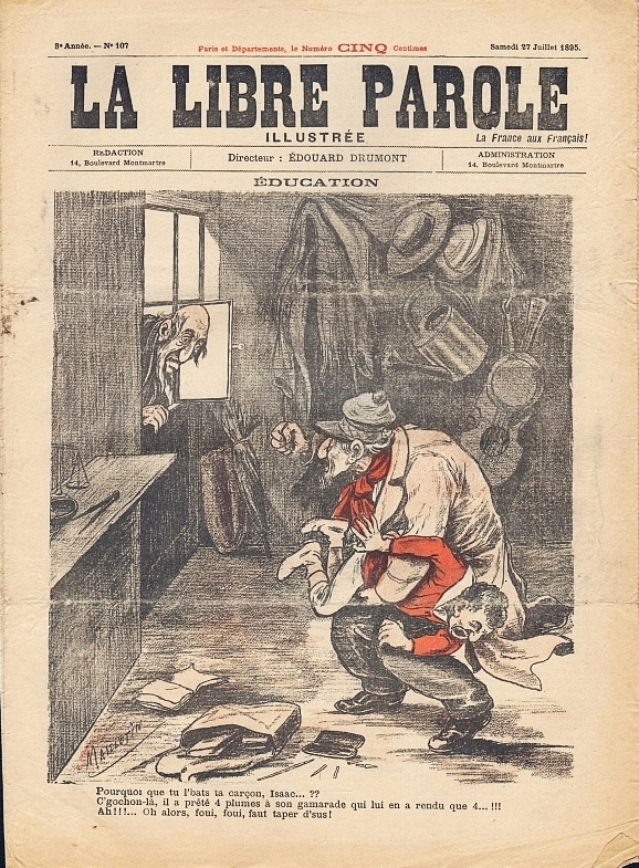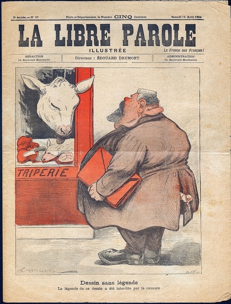 La Libre Parole illustrée (Dir. Edouard Drumont). 2e année, no. 57, 11 aout 1894. Paris 1894. 7 Seiten, illustriert. 37 x 28 cm, farbiges Cover von Chanteclair. Titelkarikatur: "Dessin sans legende. La legende de ce dessin a ete interdite par la censure". Hinterdeckel mit Bildergeschichte von G.Ri "Un bon petit commerce"