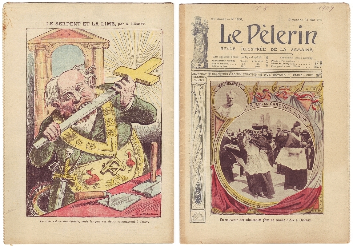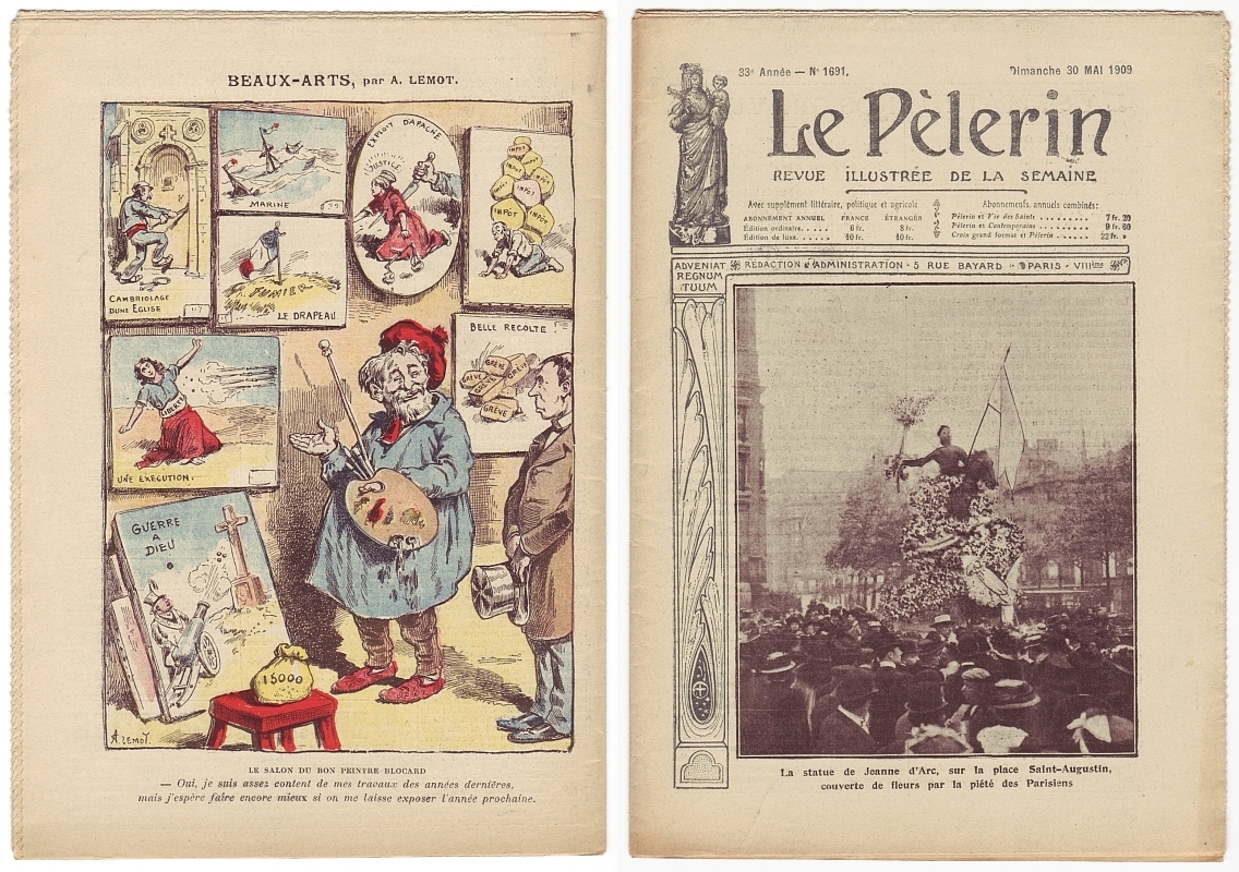 Le Pélerin. Revue illustrée de la semaine. 33e année, no. 1690, 23 Mai 1909. Paris 1909. 14 Seiten. 26,5 x 19 cm, farbiges Cover, Hinterdeckelkarikatur von A. Lemot. Mit einem Foto eines deutschen Luftschiffes (LZ3) "Un essai de dirigeable allemand en presence des deputes du Reichstag". Mittig eine doppelseitige Farbillustration von Eugene Damblans: "Lille, la police repousse les anticlericaux qui viennet, devant l'Eglise Saint-Maurice, manifester contre les Catholiques fetant la bienheureuse Jeanne d'Arc."