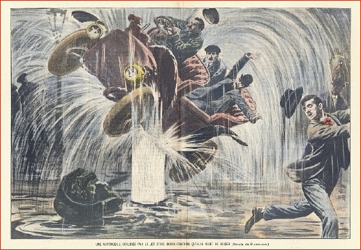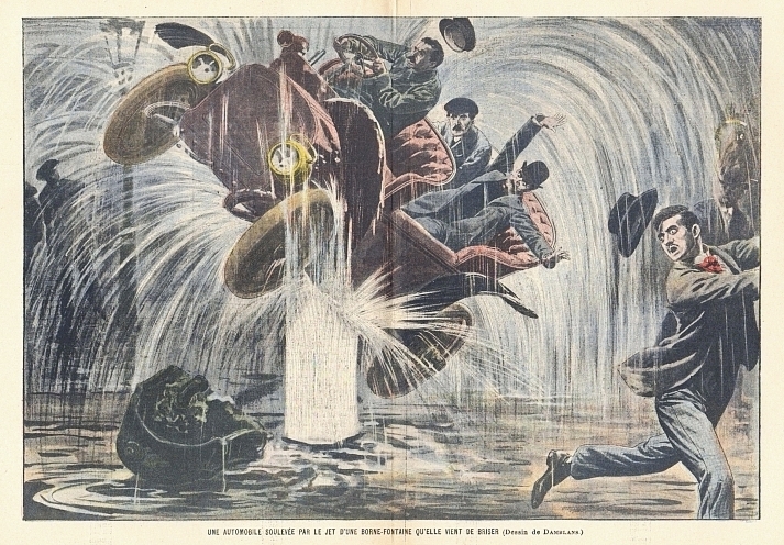 Le Pélerin. Revue illustrée de la semaine. 33e année, no. 1691, 30 Mai 1909. Paris 1909. 14 Seiten. 26,5 x 19 cm, Cover mit Titelfoto und farbiger Hinterdeckelkarikatur von A. Lemot. Mittig eine doppelseitige farbige Karikatur von Eugene Damblans: "Une automobile soulevée par le jet d'une borne-fontaine qu'elle vient de briser"