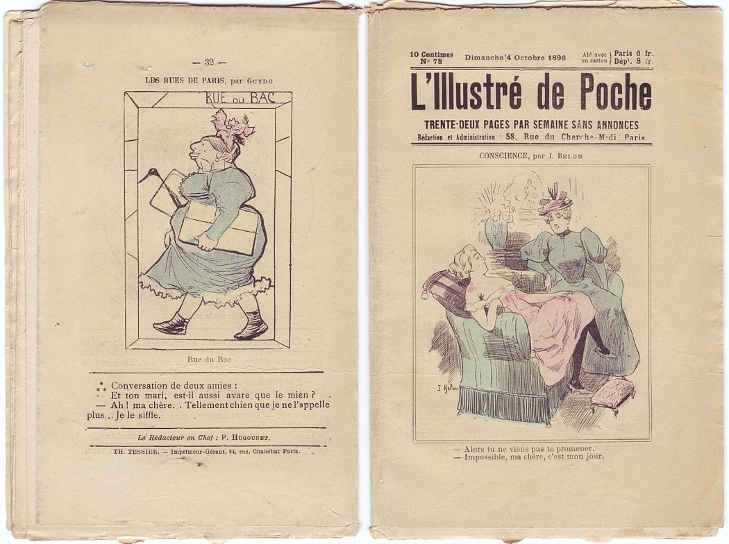 L'Illustré de Poche. Red. Paul Hugounet. Paris no. 78, 4 octobre 1896. Paris 1896. 32 Seiten, durchgehend illustriert, mittig 2 farbige Blätter. 20 x 14 cm, farbiges Cover von Jose Belon. Mit Illustrationen von Maurice Marais, B. Moloch, Huard, Jack Abeillé, Ovide Riche, Guydo, Charles Lapierre