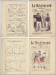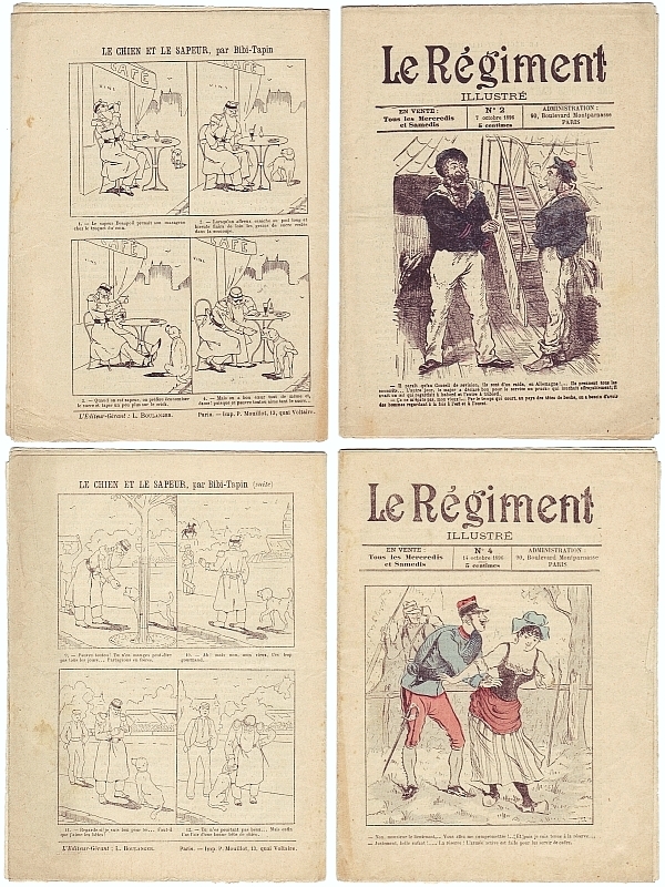 Le Régiment illustré. No. 2, 7 octobre 1896 + No. 4, 14 octobre 1896. Paris (L. Boulanger éditeur) 1896. 2 Hefte, je 15 Seiten. 21 x 15 cm, farbige Cover, hinterer Umschlag mit Karikaturen von Bibi-Tapin aus der Serie "Le chien et le sapeur"
