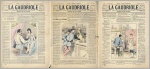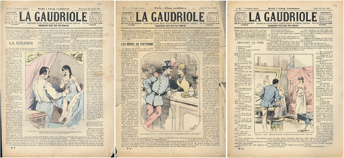 La Gaudriole. Journal de Joyeux Recits, Contes Gaulois et Romans illustrés. 1re année: No. 3, No. 6, No. 22. Paris 1891. 3 Hefte, je 8 Seiten, mit Illustrationen. 33 x 23,5 cm, farbige Cover von Charvic (2x) und P. Riclece
