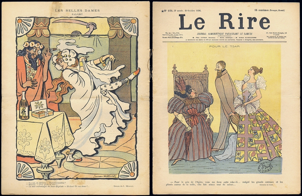Le Rire. Journal humoristique paraissant le Samedi. 2e année, No. 101, 10 octobre 1896. Paris 1896. 11 Seiten, durchgehend illustriert. 31 x 23,5 cm, farbiges Cover von Gyp und Lucien Metivet. Mit Illustrationen von Döes, Luc Leguey, Hermann-Paul, MR, Metivet, Georges Delaw, Fau, Benjamin Rabier