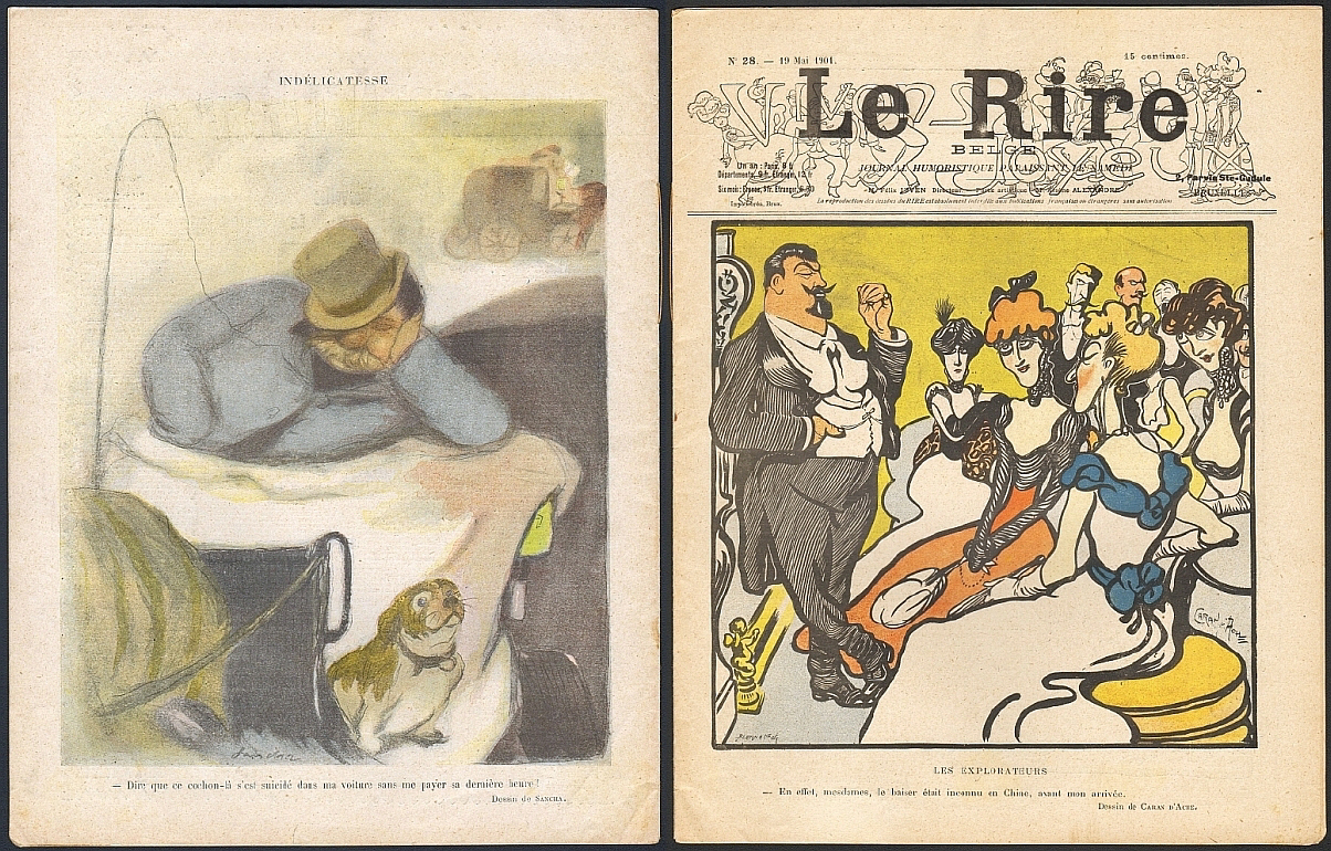 Le Rire Belge. Journal humoristique paraissant le Samedi. No. 28, 19 Mai 1901. Bruxelles 1901. 15 Seiten, durchgehend illustriert. 30,5 x 24 cm, farblith. Cover von Caran d'Ache, Hinterdeckel von Sancha. Mit Illustrationen von Caran d'Ache, Avelot, Fau, Joseph Hémard, Guydo, Georges Omry, Somm(e), C. Leandre, Ludovic Riezer u.a.