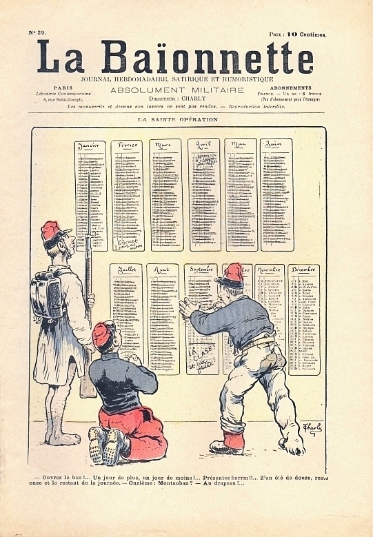 La Baionnette. Journal hebdomadaire, satirique et humoristique. Absolument militaire. No. 29. Paris (Imp. Paul Dupont) 1900-1901. 8 Seiten, durchgehend illustriert. 31 x 22 cm, farbiges Cover von Charly. Illustrationen von J. d'Aurian (Bildergeschichte), J. Morel (Bildergeschichte), Poulbot, Moriss