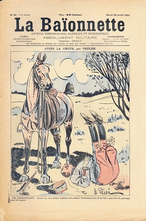 La Baionnette. Journal hebdomadaire, satirique et humoristique. Absolument militaire. No. 62. Paris (Imp. Paul Dupont) 1901. 10 Seiten, durchgehend illustriert. 31 x 22 cm, farbiges Cover von Ernest Thelem. Illustrationen von J. d'Aurian (Bildergeschichte), J. Morel (Bildergeschichte), Poulbot, Moriss