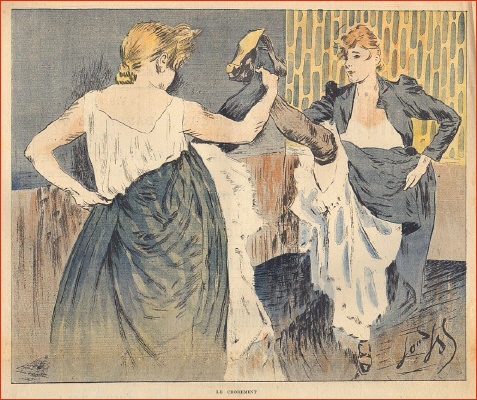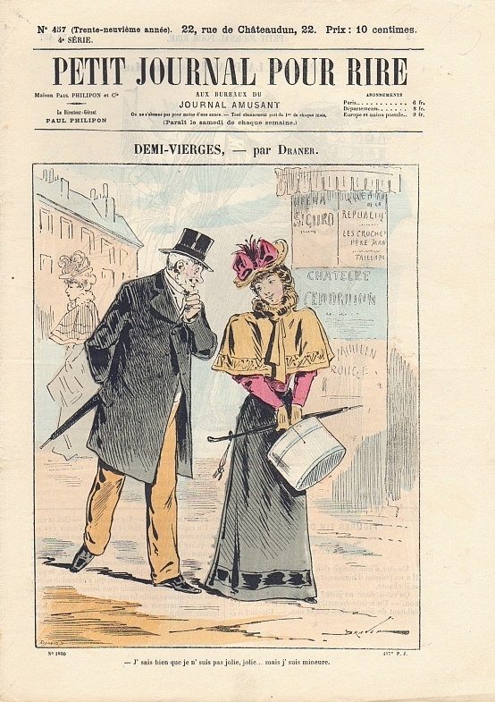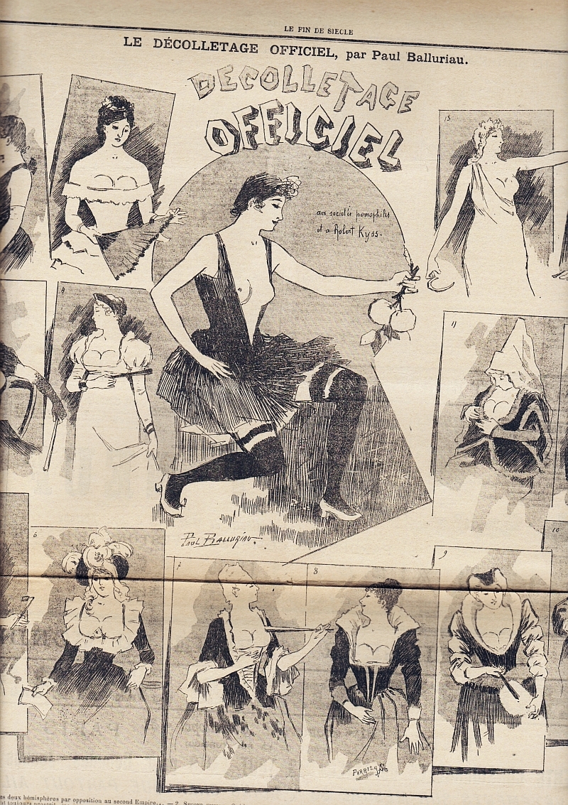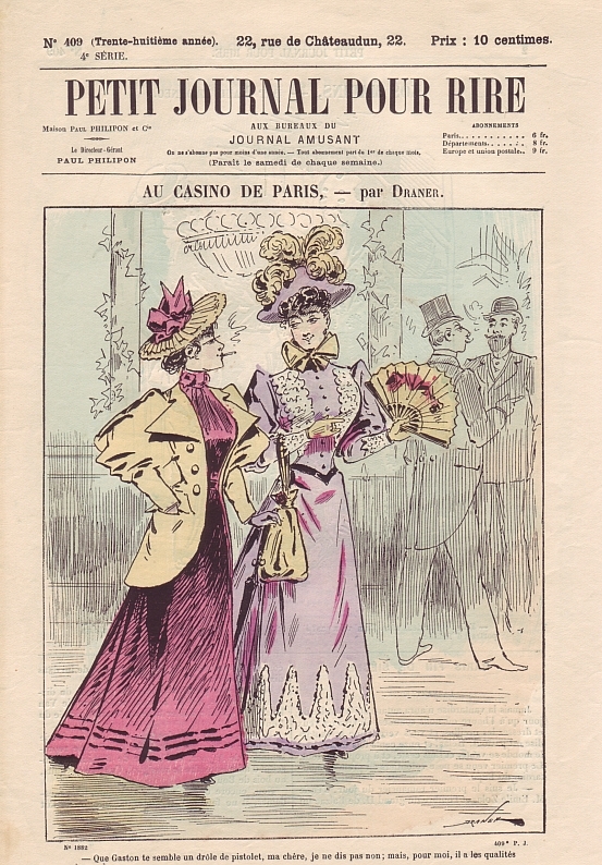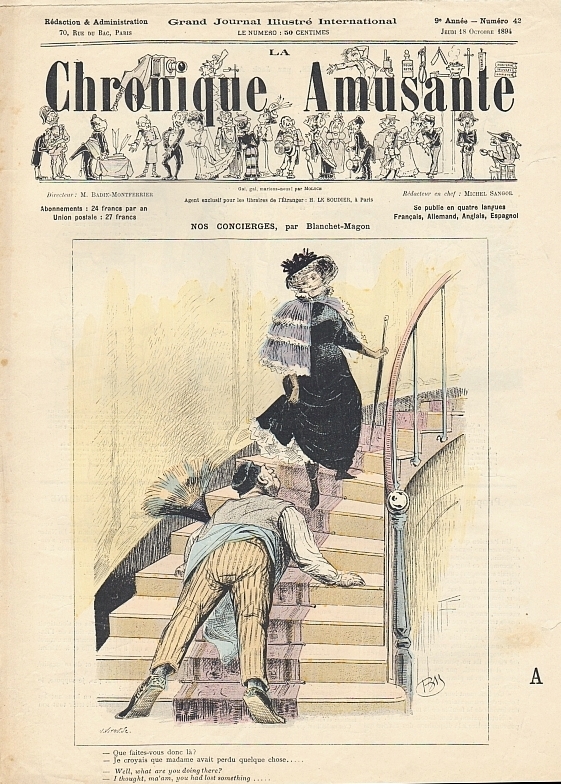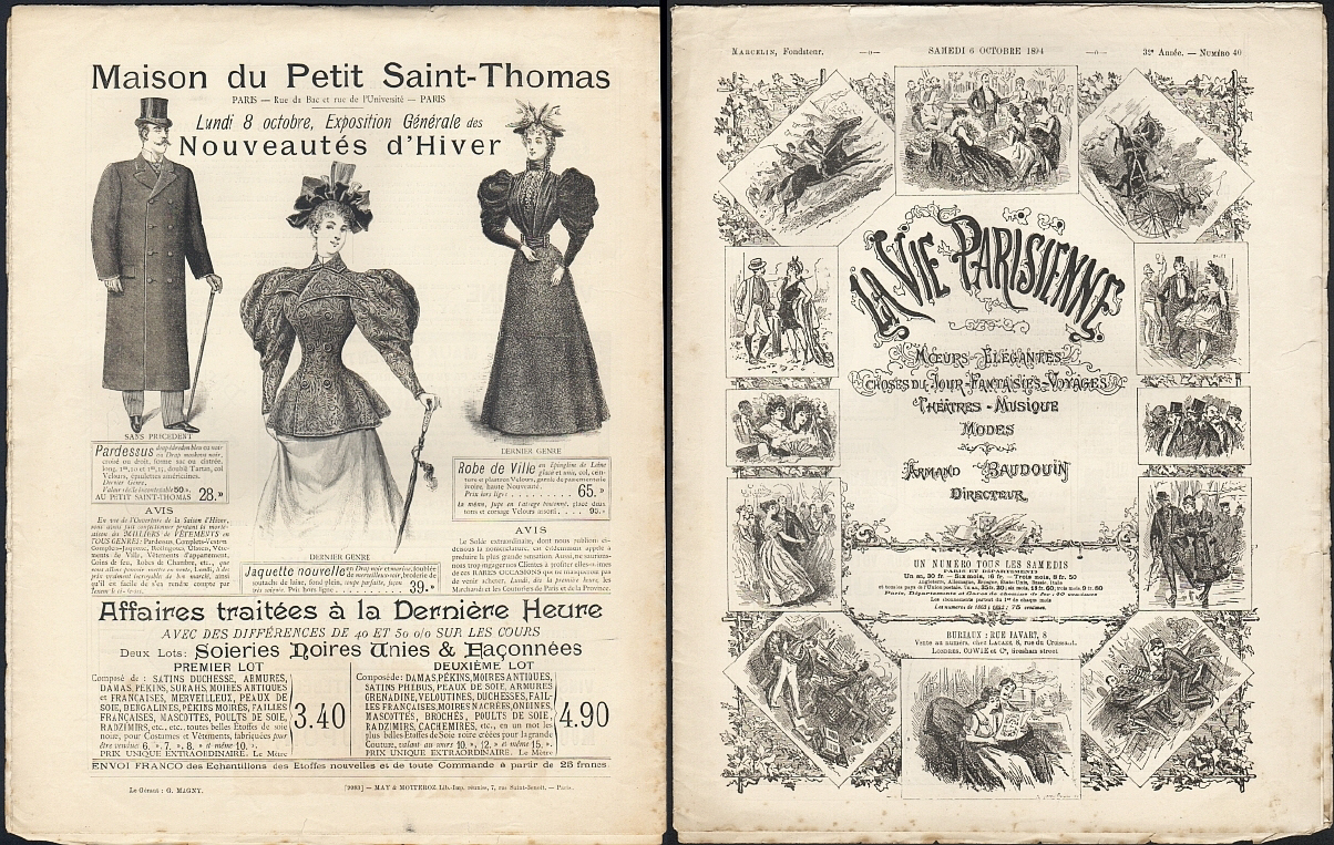 La Vie Parisienne (Dir. Armand Baudouin). 32e année, no. 40, 6 Octobre 1894. Paris (May & Motteroz) 1894. 16 Seiten (SS. 555-567), illustriert. 35 x 27,5 cm, Cover illustriert. Mit einer illustrierten Doppelseite "Leurs Lorgnettes" und einer doppelseitigen Bildergeschichte "Sur le chemin de la sacristie". Rückseitig eine Modeanzeige von Maison du petit Saint-Thomas