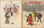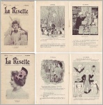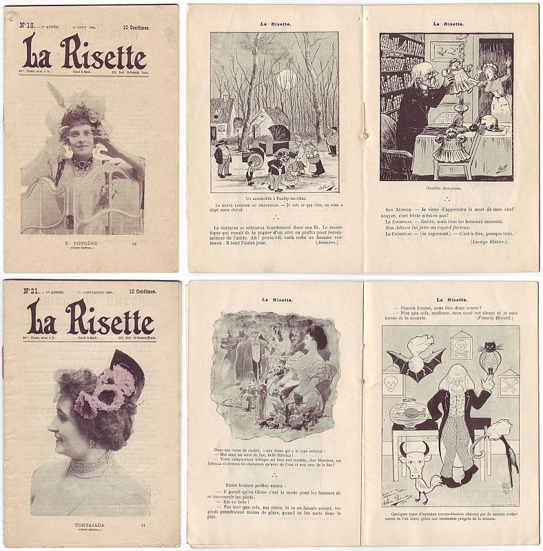 La Risette. 1re année, no. 18, 21 aout 1900 + no. 21, 11 septembre 1900. Paris 1900. 2 Hefte, je 20 Seiten, durchgehend illustriert. 20 x 13 cm, mit photographischer Umschlagillustration. Mit humoristischen Beiträgen aus diversen Zeitschriften (Lustige Blätter, Pearson's Weekly, Der Floh, Das Fidele Haus u.a.) mit Karikaturen verschiedener Künstler: Moli, Moriss, Maurice Millier, Viriez, HP Chatelaine, Arthur Perrier, Hall, Ludovic Riezer, V. Schuster, F. Horsky u.a.