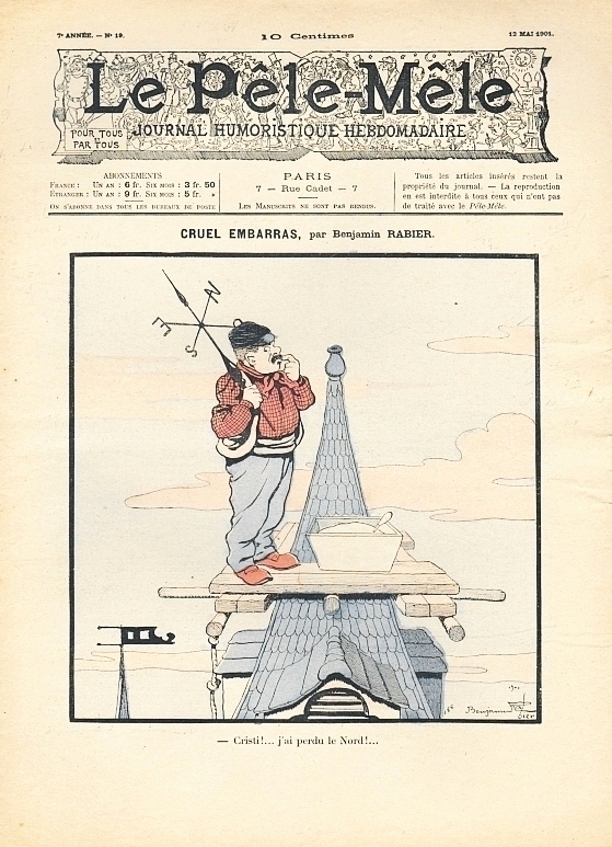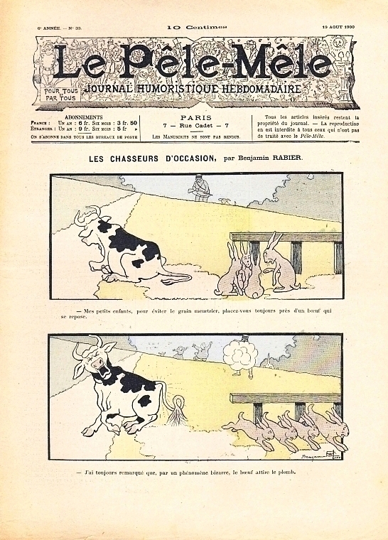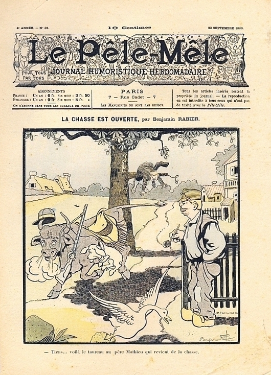 Le Pêle-Mêle. Journal humoristique hebdomadaire. 7e année, no. 19, 12 Mai 1901. Paris (Imp. G. Richard) 1901. 15 Seiten, durchgehend illustriert. 32 x 23,5 cm, farbiges Cover. Titelbild und weitere Illustrationen von Benjamin Rabier, außerdem G.Ri, Guillaume, Monnier