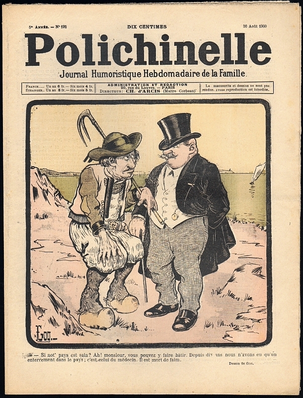 Polichinelle. Journal Humoristique Hebdomadaire de la Famille. 5e année, No. 192, 26 Aout. Paris 1900. 16 Seiten, durchgehend illustriert. 31 x 24 cm, farbiges Cover von Gog. Mit Illustrationen von Rycemot (Bildergeschichte), Jan Méjan, Georges Chamonin, Jan Duch; Toby, H. Lenoir, V. Schuster, Moriss, Valverane, A. Boulot, Georges Omry, Effel, Pol André, Falco, H. Ferran, Jacques Charles