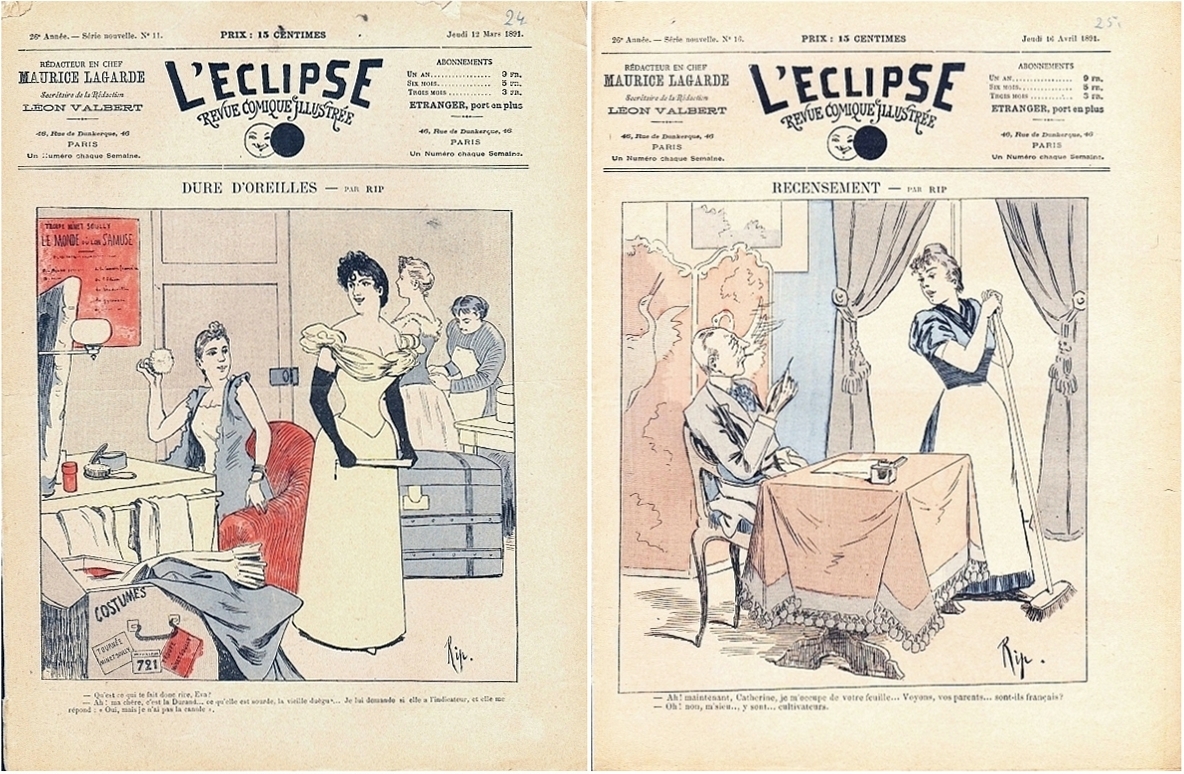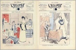 L'Eclipse. Revue Comique Illustrée. Red. Maurice Lagarde. 26e année, serie nouvelle, no. 11 + no. 16. Paris 1891. 2 Hefte, je 16 Seiten, durchgehend illustriert. 32,5 x 24,5 cm, farbige Cover von Rip. Mit einer Bismarck-Karikatur in 6 Bildern in Nr. 11, weitere Illustrationen von George Edward, Blanchet Magon