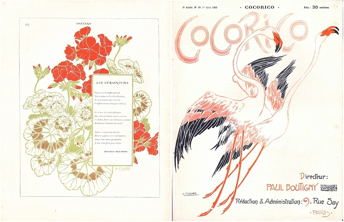 Cocorico (Dir. Paul Boutigny). 3e année, No. 38, 1er Aout 1900. Paris 1900. 8 Seiten, teils farbig illustriert. 31 x 24 cm, farblithographiertes Cover und Illustrationen im Stil des Art Nouveau von Adolphe Cossard. Mit einer blattgroßen Lithographie von Jules Cheret