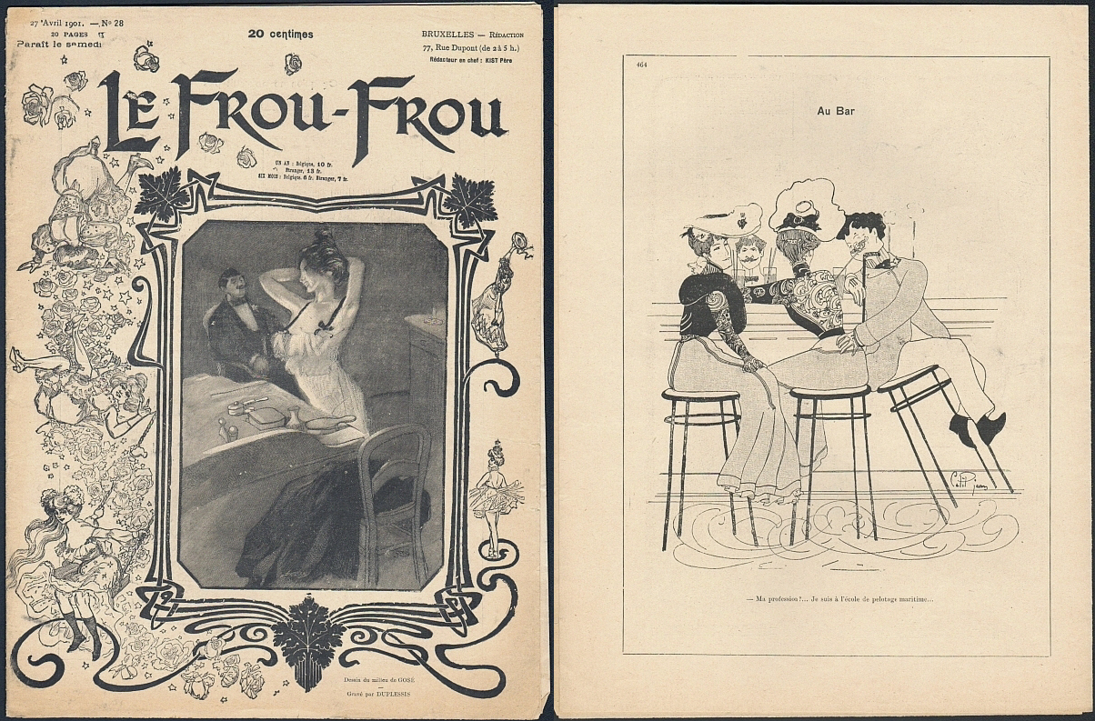 Le Frou-Frou. Red. Pere Kist. 27 Avril 1901, No. 28. Bruxelles (Imp. Vanbuggenhoudt) 1901. 16 Seiten (SS. 454-468), durchgehend illustriert, 4 Seiten Supplement. 29 x 22 cm, Cover von Gose / Duplessis. Mit Illustrationen von George Meunier, H. Gerbault, Sandy Hook, Cepil Jean, Louis Malteste, Albert Guillaume, Adolphe Willette
