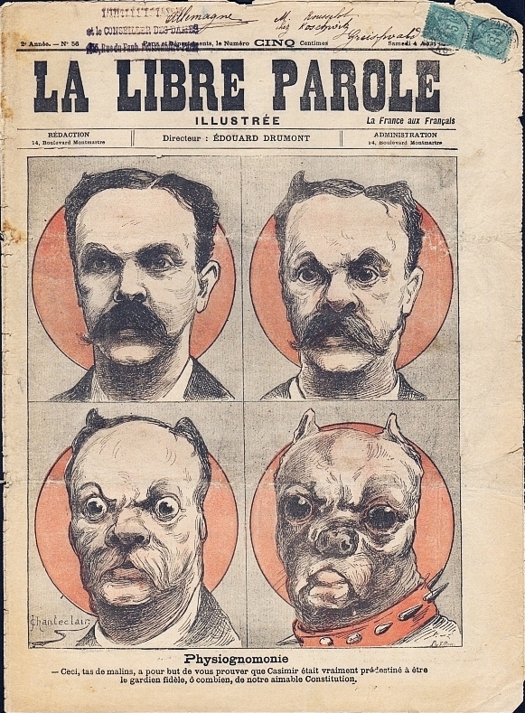 * Meist waren in diesem antisemitischen Magazin groteske Darstellungen französischer Juden zu finden, dieses Titelbild jedoch zeigt den Politiker Jean Casimir-Périer, der im Juni 1894 zum Präsidenten der Republik gewählt worden war. Die Transformation seines Kopfes in den einer Bulldogge beweist, "dass er prädestiniert ist, den getreuen Wächter unserer liebenswerten Verfassung abzugeben."