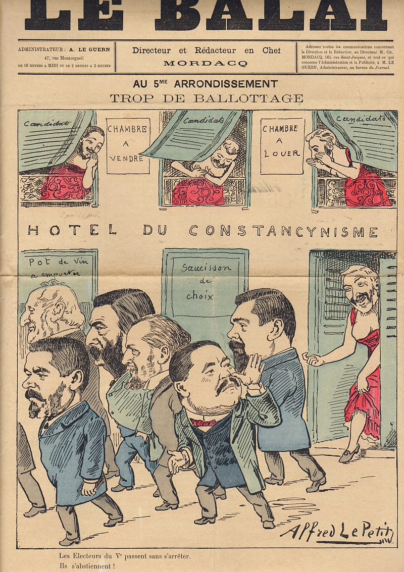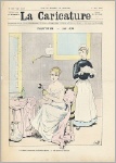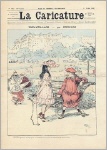 La Caricature. Journal hebdomadaire (Dir. E. Kolb). 12e année, No. 586. Paris 1891. 8 Seiten, durchgehend illustriert. 38 x 28 cm, farbiges Cover von F. Bac. Mit Illustrationen von Godefroy, Laudati, A. Vignola, A. Robida, Draner, A. Falco, E. Damblans, A. Guillaume, Steinlen, M. Radiguet