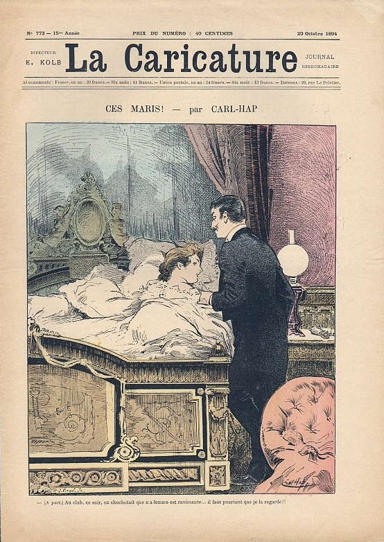 La Caricature. Journal hebdomadaire (Dir. E. Kolb). No 773, 15me année, 20 Ocotobre 1894. Paris 1894. 8 Seiten (SS. 330-336), durchgehend illustriert. 39 x 27,5 cm, farbiges Cover von Carl-Hap. Mit Illustrationen von M. Radiguet, Godefroy, Daisne, T. Charly u.a.