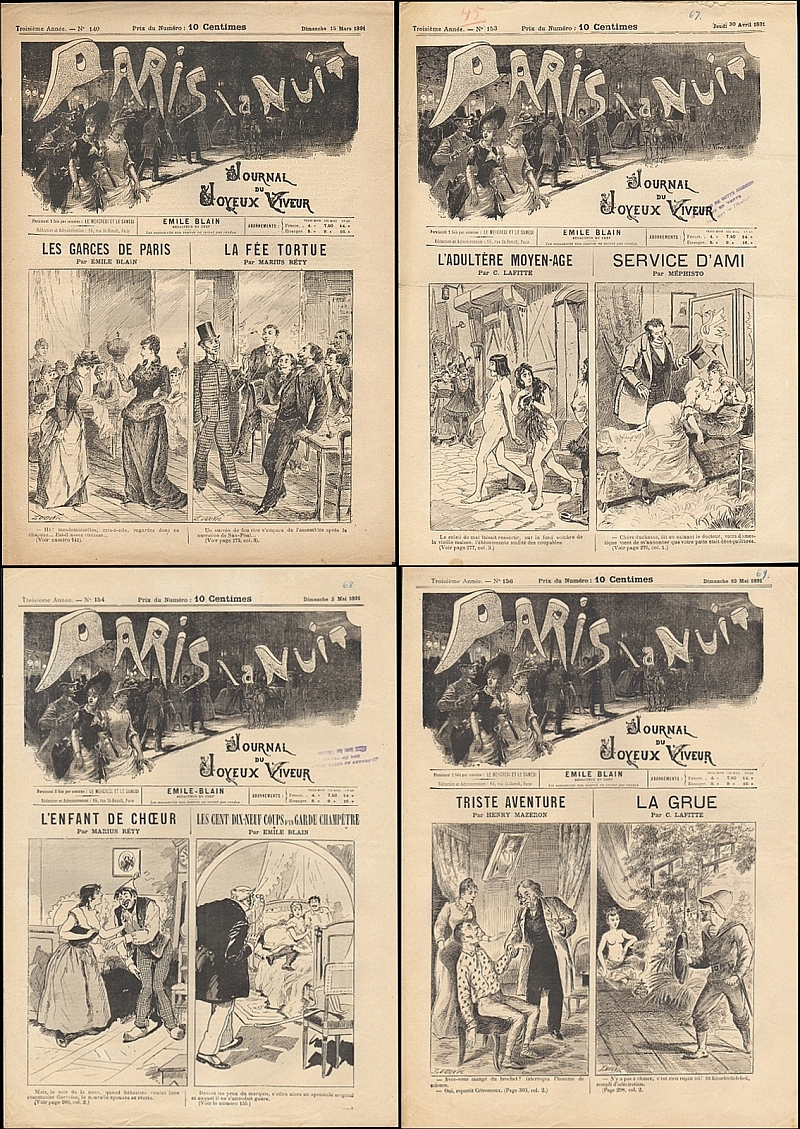 Paris la Nuit. Journal du Joyeux Viveur (Red. Emile Blain). 3e année, no. 140, no. 153, no. 154, no. 156 (= 4 Hefte). Paris 1891. Je 8 Seiten, illustriert. 41,5 x 29,5 cm.