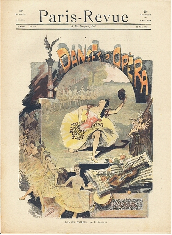 Paris-Revue. 3e année, no. 110, 21 Mars 1891. Paris 1891. 8 Seiten, illustriert. 40 x 30 cm, farbiges Cover von Auguste-François Gorguet "Danses d'Opera"