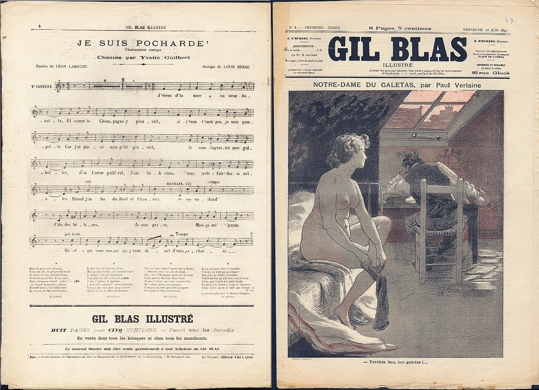 * Die erste Nummer! Mit Titelpoem von Paul Verlaine "Notre-Dame du Galetas", Bildergeschichte von MAX. Rückseite mit einem Chanson von Louis Byrec "Je suis pocharde" (chantée par Yvette Guilbert)