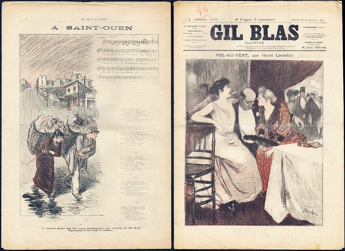Gil Blas illustré. Red. R. d'Hubert. 1re année, no. 5, 26 Juillet 1891. Paris 1891. 8 Seiten, illustriert. 40 x 27 cm, Cover mit getönter Illustration von Steinlen. Mit Titelstory von Henri Lavedan "Vol-au-vent", Bildergeschichten v. Guillaume. Rückseite mit einem illustrierten Chanson