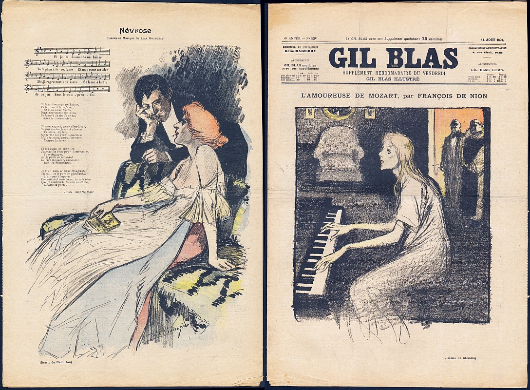 Gil Blas illustré. Dir. Rene Maizeroy. 6e année, no. 33, 14 aout 1896. Paris 1896. 8 Seiten, illustriert. 41 x 27,5 cm, farbiges Cover von Steinlen. Titelstory "L'Amoureuse de Mozart". Mittig eine blattgroße Jugendstil-Farbillustration von Paul Balluriau. Rückseite mit einem Chanson von Jean Grandeau und Illustration von Balluriau