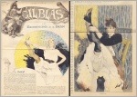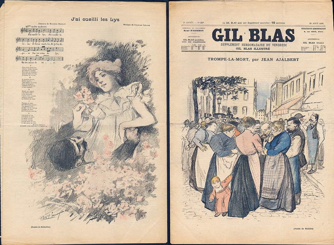 Gil Blas illustré. Dir. Rene Maizeroy. 6e année, no. 35, 28 aout 1896. Paris 1896. 8 Seiten, illustriert. 41 x 27,5 cm, Cover farbig illustriert von Steinlen. Mit Titelstory "Trompe-la-Mort" von Ajalbert. Mittig eine blattgroße Jugendstil-Farbillustration von Paul Balluriau. Rückseite mit einem Chanson von Boukay / Levade und Illustration von Balluriau
