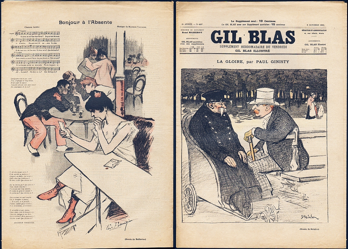 Gil Blas illustré. Dir. Rene Maizeroy. 6e année, no. 40, 2 Octobre 1896. Paris 1896. 8 Seiten, illustriert. 41 x 27,5 cm, Cover farbig illustriert von Steinlen. Mit Titelstory "La Gloire" von Paul Ginisty. Mittig eine blattgroße Jugendstil-Farbillustration von Paul Balluriau. Rückseite mit einem Chanson von Maurice Vaucaire und Illustration von Balluriau
