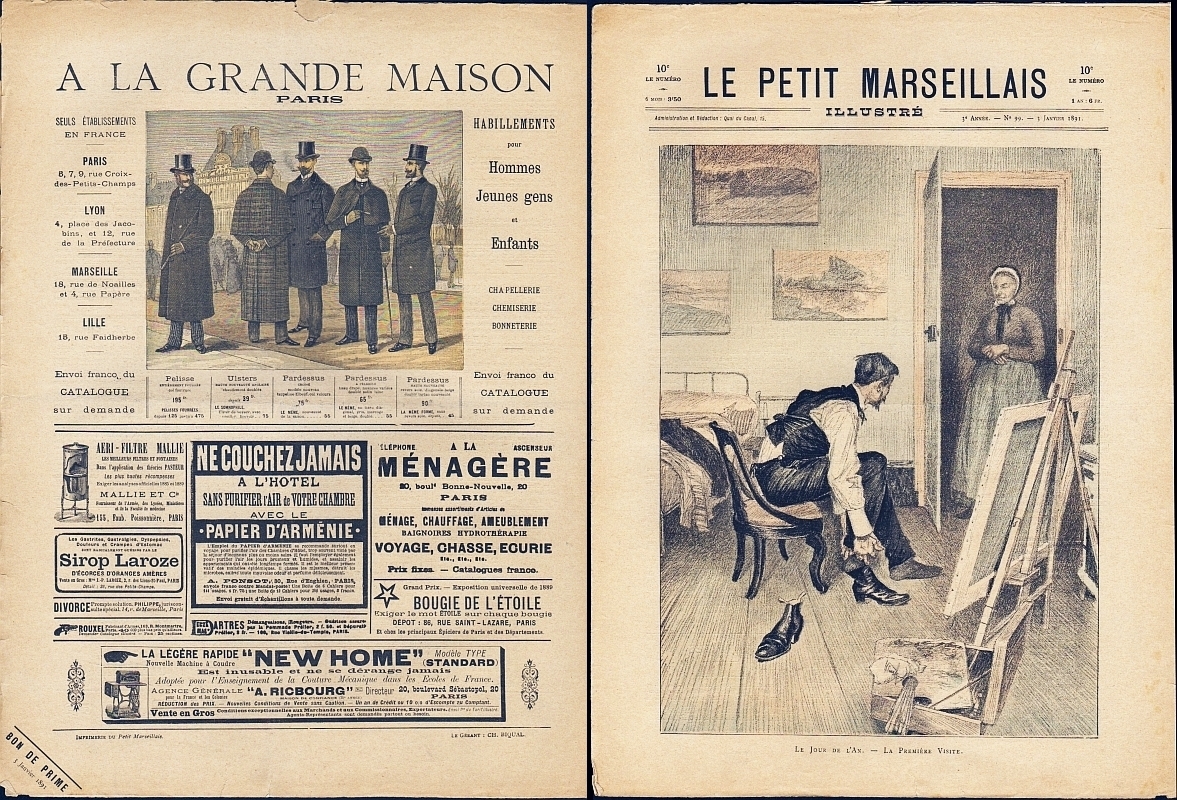 Petit Marseillais illustré. 3e année, no. 99, 3 Janvier 1891. Marseille 1891. 8 Seiten (SS. 82-87), illustriert. 40 x 30 cm, farbiges Cover. Illustriert von Blanchet-Magon. Rückseite mit farbig illustrierter Annonce "A La Grande Maison Paris"