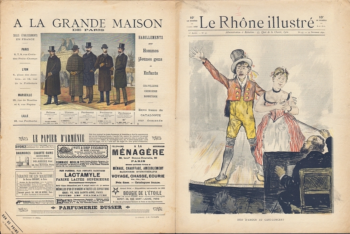 Le Rhône illustré. 1re année, no. 27, 22 Novembre 1890. Lyon 1890. 8 Seiten (SS. 34-39), illustriert. 40 x 30 cm, farbiges Cover von Raffaelli. Rückseite mit farbig illustrierter Annonce "A La Grande Maison Paris"
