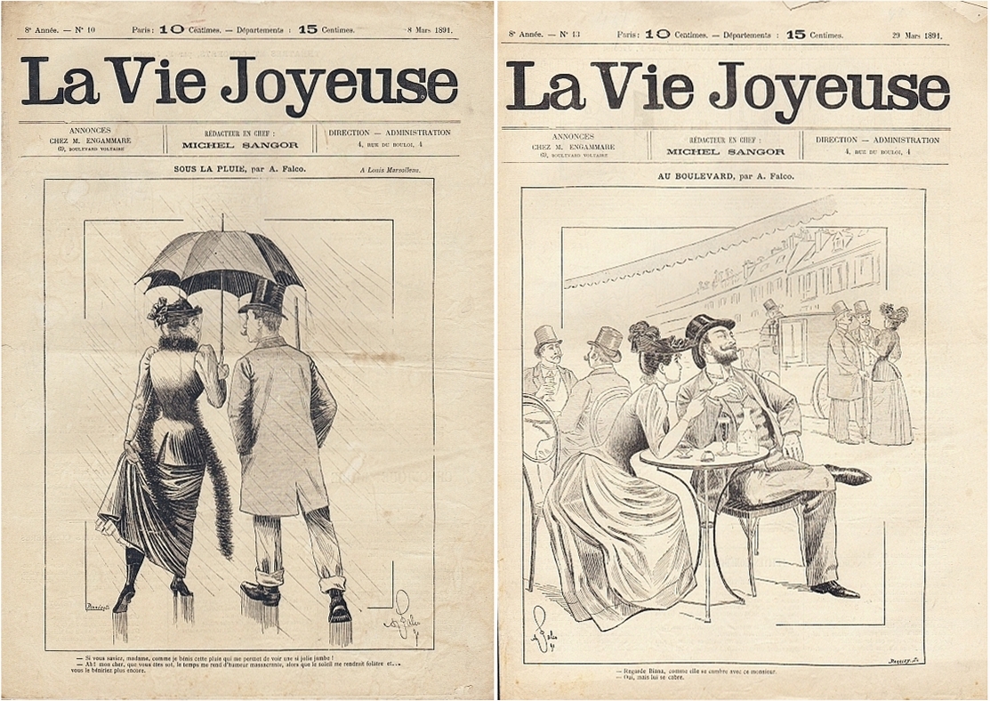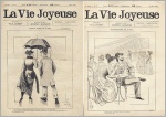 La Vie Joyeuse (Red. Michel Sangor). 8e année, no. 10, 8 Mars + no. 13, 29 Mars 1891 (= 2 Hefte). Paris 1891. Je 8 Seiten, durchgehend illustriert. 40 x 29 cm, Cover illustriert von A. Falco. Mit Cartoons und Bildergeschichten von Jehan Testevuide, George Edward, Blanchet-Magon, F. Jacotot, Clemencon, O'Gallop O'Gallop, Jonas, Benjamin Rabier
