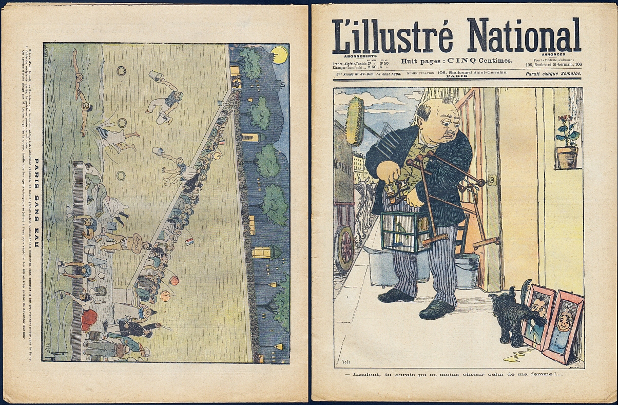 L'Illustré National. 3e année no.33, 19 Aout 1900. Paris 1900. 8 Seiten, durchgehend illustriert. 38 x 29,5 cm, farbiges Cover. Mit Cartoons und Bildergeschichten von Emile Cohl, André Rouveyre, Gog; farbige Hinterdeckel-Illustration von Leon Lebegue