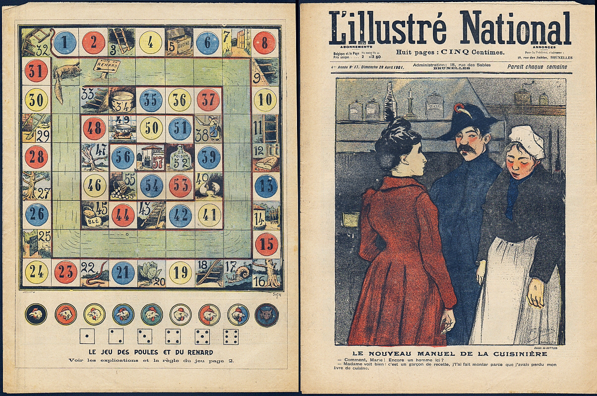 L'Illustré National. 4e année, no. 17, 28 Avril 1901. Bruxelles 1901. 8 Seiten, durchgehend illustriert. 38 x 29,5 cm, farbiges Cover von F.L. Gottlob. Mit einem blattgroßen farbigen Bastelbogen für eine Windmühle, Cartoons und Bildergeschichten von Viriez, Philippe Norwins, Leon Lebegue sowie einem farbigen Spielplan von "Le Jeu des Poules et du Renard" auf dem Hinterdeckel