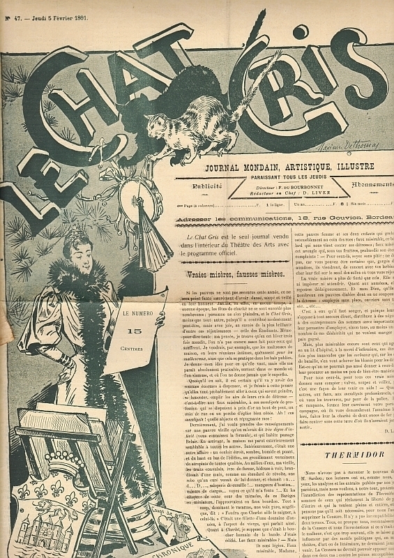 Le Chat Gris. Journal Mondain, Artistique, Illustré. No. 47, 5 Fevrier 1891. Bordeaux 1891. 4 Seiten, illustriert. 52 x 40 cm, Cover illustriert. Mit einer blattgroßen Bildergeschichte von BOUM, rückseitig Annoncen