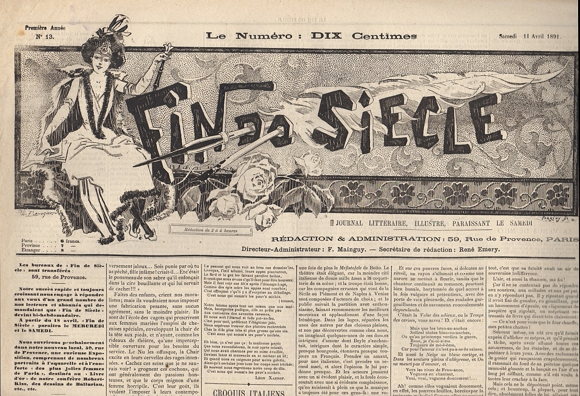 Fin de Siecle. Journal littéraire, illustré. Dir. F. Maingny. Première année, no. 9, 13, 15, 29, 38, 39, 45 (= 7 Hefte des ersten Jahrgangs). Paris 1891. Je 4 Seiten, illustriert. 65 x 46 cm. Jeweils mit Illustrationen von Paul Balluriau