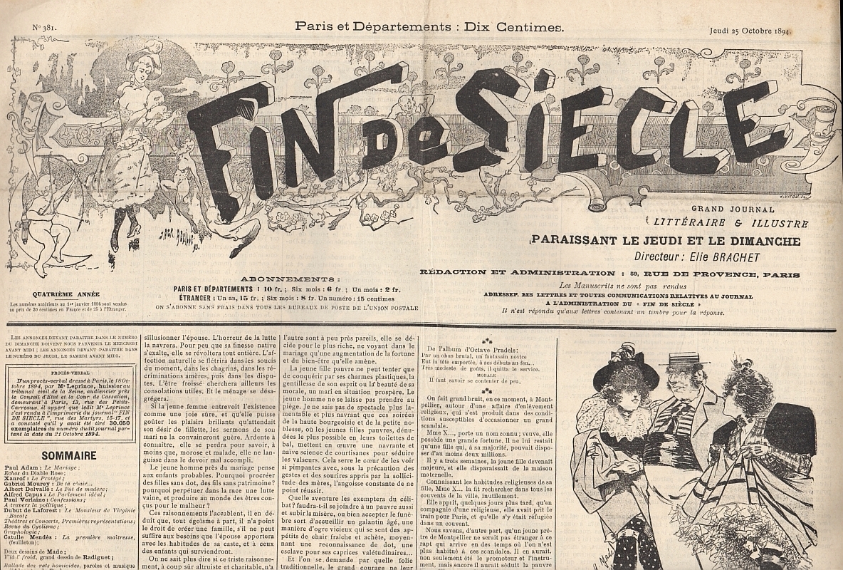 Fin de Siecle. Grand Journal littéraire & illustré. Dir. Elie Brachet. Quatrième année, No. 381 + No. 383. Paris 1894. 2 Hefte, je 4 Seiten, illustriert. 62 x 45 cm. Mit Illustrationen von Maurice Radiguet und Maurice Neumont