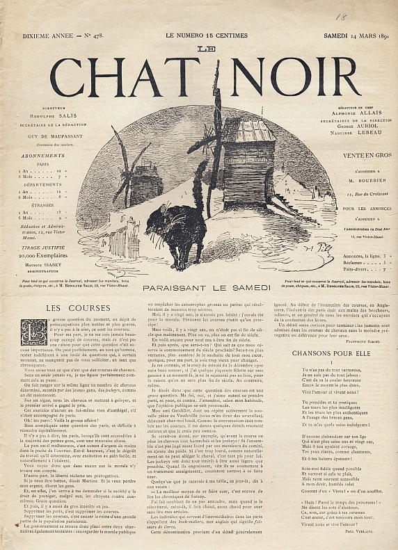 Le Chat Noir. Red. Alphonse Allais. 10e année, no. 478, 14 Mars 1891. Paris 1891. 4 Seiten (SS. 1712-1714), illustriert. 45 x 31 cm. Mit einer blattgroßen Bildergeschichte von E. Cottin. * Directeur: Rodolphe Salis; Secretaire de la Redaction: Guy de Maupassant.