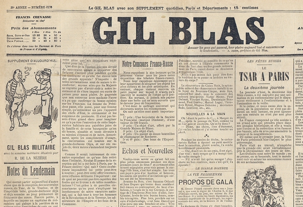 Le Gil Blas (18e année, no. 6170) avec son Supplément ... Gil Blas Militaire (1re année, no. 31). 8 Octobre 1896. Paris 1896. Je 4 Seiten, illustriert. 64 x 46 und 46 x 32 cm. Die Militär-Beilage mit Illustrationen von Raymond de la Nezière und mit einem Bericht "La prise de Geok-Tepe" von Skobeleff mit Kartenskizze