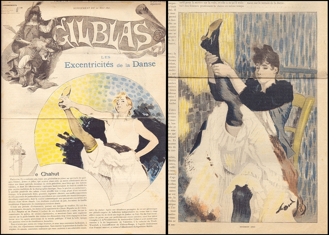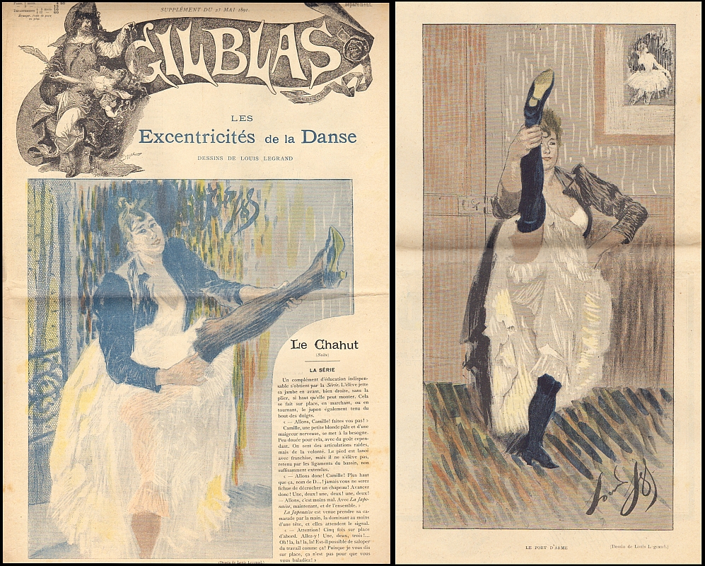 Gil Blas. Supplément du 10 Mai + 23 Mai 1891: Les Excentricités de la Danse. Dessins de Louis Legrand. Paris 1891. 2 Hefte zum Thema "TANZ", je 8 Seiten, teils farbig illustriert. 47 x 32 cm, farbige Cover. Mit jeweils 4 farbigen und 3+5 s/w-Illustrationen von (Ballett-) Tänzerinnen von Louis Legrand