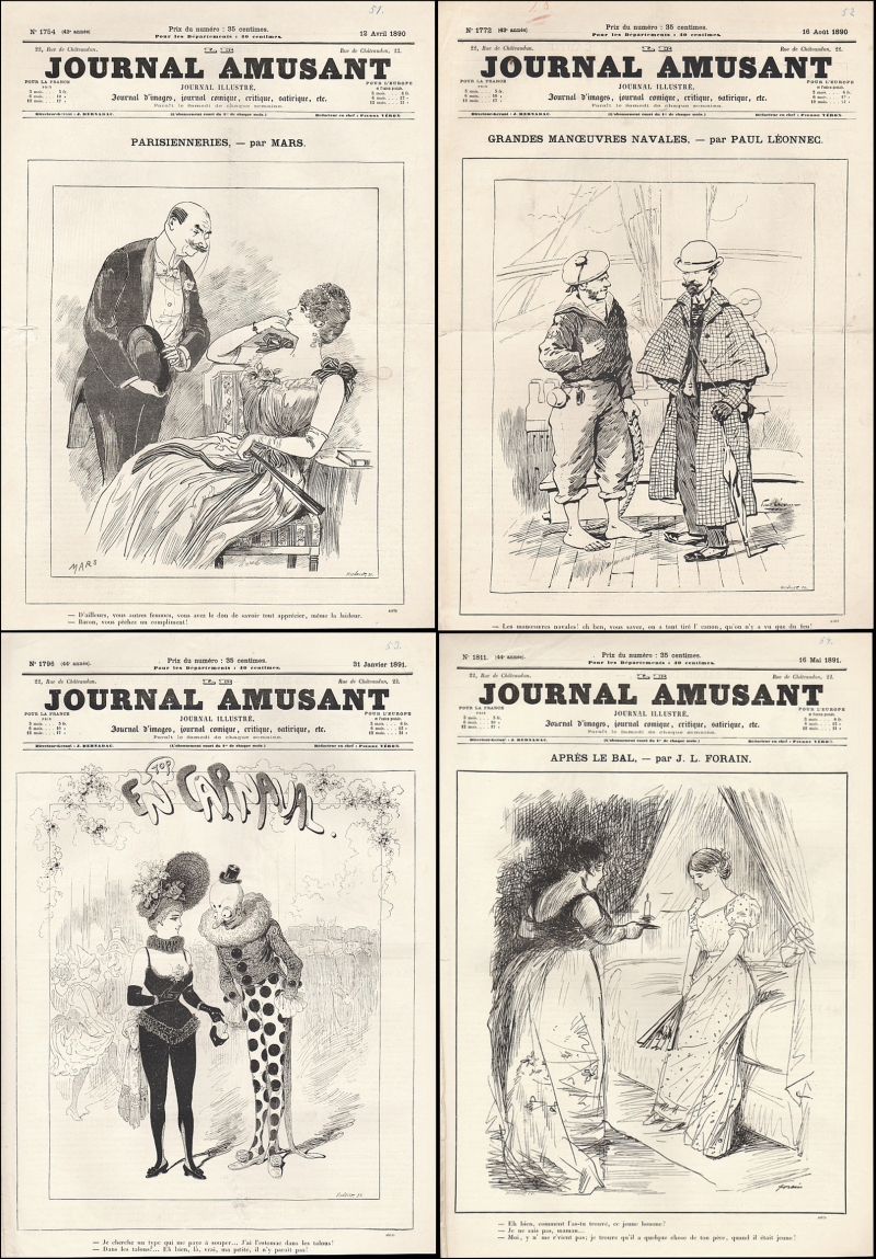 Le Journal Amusant. Journal illustré. Journal d'images, journal comique, critique, satirique, etc. No. 1754 (12 Avril 1890) - No. 1772 (16 Aout 1890) - No. 1796 (31 Janvier 1891) - No. 1811 (16 Mai 1891) = 4 Hefte. Paris 1890-1891. Je 8 Seiten, durchgehend illustriert. 44 x 31 cm, Cover illustriert. Mit Cartoons und Bildergeschichten von MARS, J. Blass, Paul Leonnec, Henriot, Forain, Stop, Jules Baric u.a.