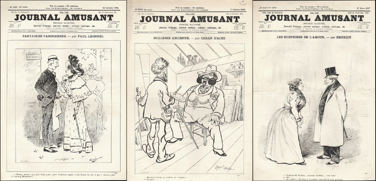 Le Journal Amusant. Journal illustré. Journal d'images, journal comique, critique, satirique, etc. No. 1990 (20 Octobre 1894) - No. 2092 (3 Octobre 1896) - No. 2117 (27 Mars 1897) = 3 Hefte. Paris 1894-1897. Je 8 Seiten, durchgehend illustriert. 44 x 31 cm, Cover illustriert. Mit Cartoons und Bildergeschichten von MARS, Paul Leonnec, Henriot, Forain, Stop, Jules Baric, Draner, Caran d'Ache u.a.