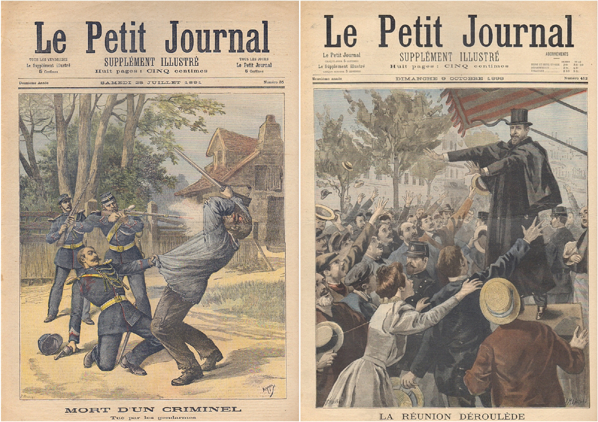 Le Petit Journal. Supplement illustré. 1re annee, no. 4 (20 Decembre 1890) - 2e année, no. 17 (21 Mars 1891) - no. 35 (25 Juillet 1891) = 3 Hefte. (Paris) 1890-1891. Je 8 Seiten. 45 x 31 cm, farbige Cover. Mit farbigen Illustrationen zur Affaire Gouffe, Chasseurs Alpins, un ballon foudroye a Chicago (Godard et Panis, aeronautes francais blesses) u.a.