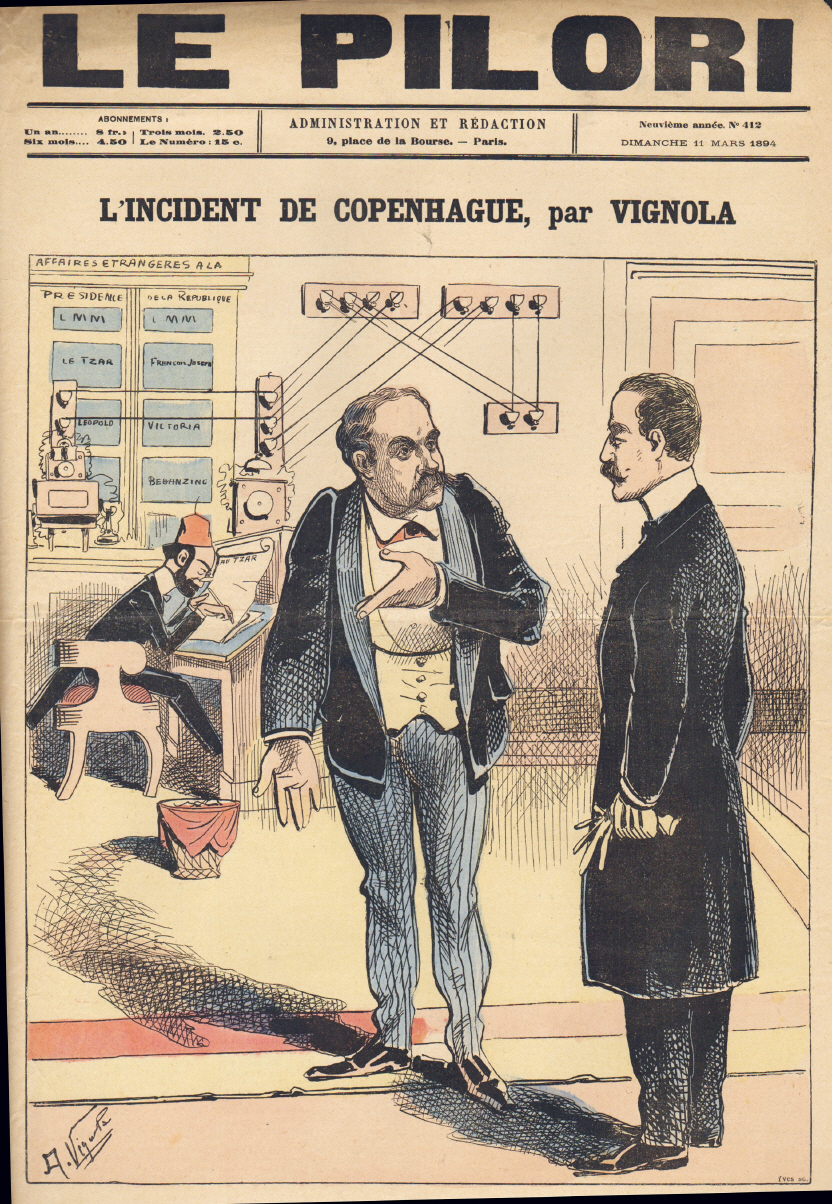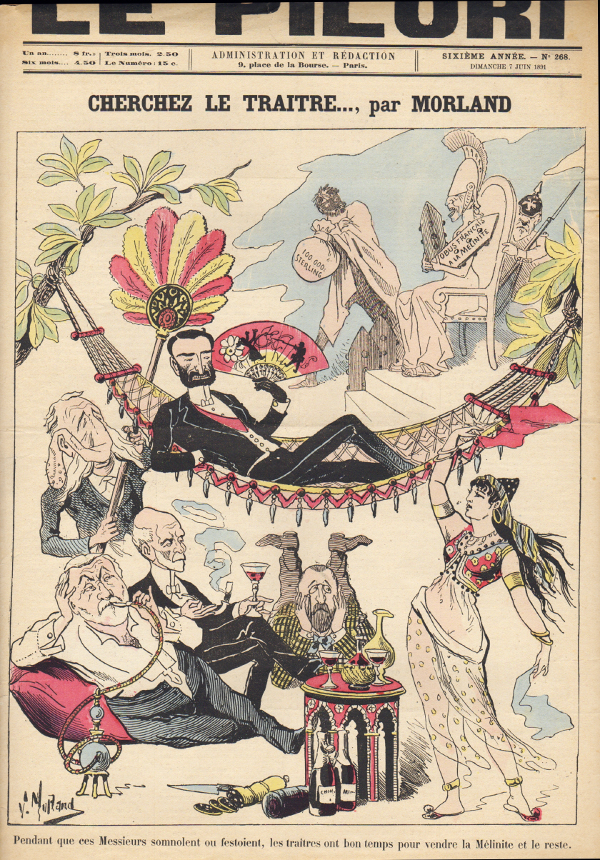 La Caricature. Journal hebdomadaire (Dir. E. Kolb). 12e année, No. 594. Paris 1891. 8 Seiten, durchgehend illustriert. 38 x 28 cm, farbiges Cover von Job. Mit Illustrationen von Godefroy, Laudati, A. Vignola, A. Robida, Draner, A. Falco, E. Damblans, A. Guillaume, M. Radiguet