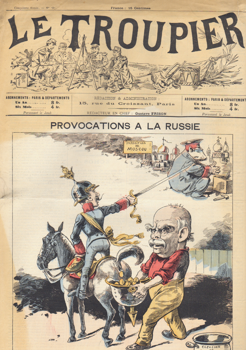 Le Troupier. Red. Gustave Frison. 5e année, no. 87. Paris 1894. 4 Seiten. 49 x 33 cm, Cover mit farbiger Titelkarikatur von Bismarck "Provocations a la Russe", Bismarck: "Allons je crois que le moment est proche ou le Petit aura encore besoin de mes services"