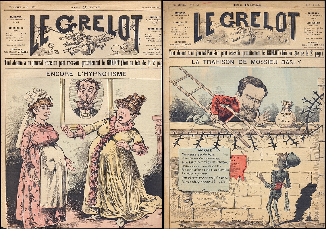 Le Grelot. 20e année, no. 1029, 28 Décembre 1890 + 21e année, no. 1045, 19 Avril 1891. Paris 1891. 2 Hefte, je 4 Seiten. 49 x 33 cm, farbige Cover
