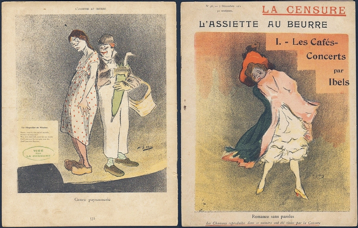 L'Assiette au Beurre. "Les Cafés-Concerts" (I), No. 36, 7 Decembre 1901. (Paris) 1901. 16 Seiten (SS. 558-572), durchgehend illustriert. 31 x 24 cm, farbiges Cover. Von Henri-Gabriel Ibels gestaltetes Heft mit 7 blattgroßen farbigen (eine doppelseitig) und 8 s/w Illustrationen.