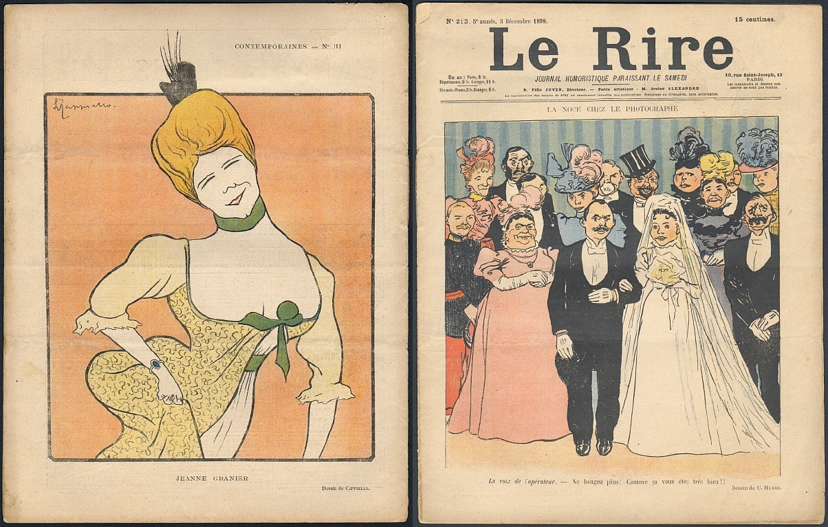 Le Rire. Journal humoristique paraissant le Samedi. 5e année, No. 213, 3 Décembre. Paris 1898. 11 Seiten, durchgehend illustriert. 31 x 23,5 cm, farbiges Cover von Huard und Cappiello. Mit Illustrationen und Bildergeschichten von L. Metivet, Roubille, Radiguet, Dépaquit, Lebegue u.a.